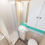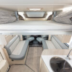 2/4 berth motorhome with central drop down bed. Our F Line 60s have a half dinette giving 4 seatbelts. As the fridge runs on electric & battery only, this motorhome is not suitable for long periods off grid unless you hire a generator.