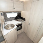 The Auto-Trail F-60 gives you flexible living with an ingenious design thanks to a large rear washroom and ergonomic kitchen. Coming in at under six metres it is still classed as a compact leisure vehicle, however this doesn’t mean that it lacks in comfort or features. The electric drop-down bed is an ingenious addition that means that no space is taken up in the day by a fixed bed, allowing you to make full use of the living area with the added benefit of a more manoeuvrable coachbuilt motorhome to drive. It can sleep 4, but in a very tight space.